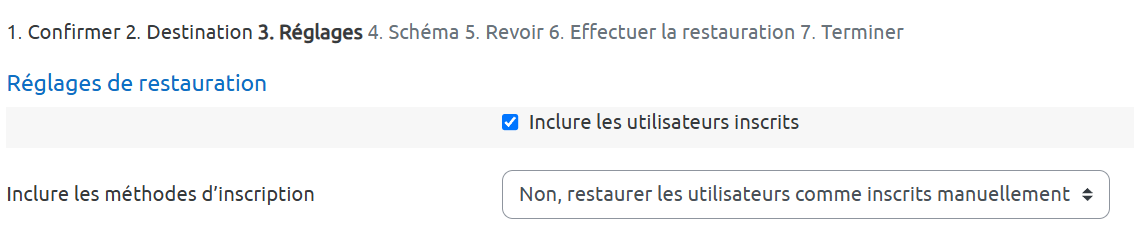Nous avons créé un cours modèle à télécharger à l'attention des enseignants qui souhaitent mettre en place la solution. Lors de la restauration du cours, vous devez, tel que montré dans l'image ci-dessous :