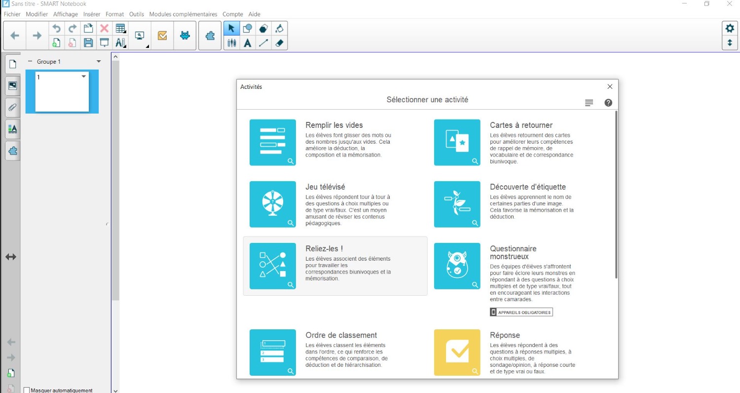 Dans l'application Smart Notebook de votre bureau, vous avez la possibilité de créer des activités pour rendre actifs vos élèves et dynamiser votre cours. Certaines activités exigent que les élèves utilisent leur appareil (ordinateur, Chromebook ou cellulaire) pour répondre.