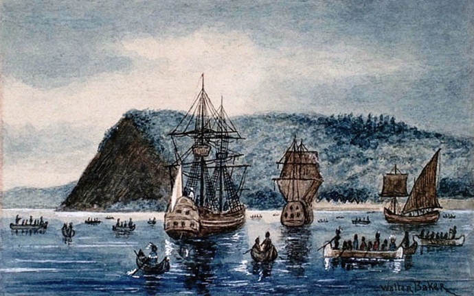 Source : Walter Baker, L'arrivée de Jacques Cartier à Stadaconé, 1535 (entre 1890 et 1912), Bibliothèque et Archives Canada, MIKAN 2896469. Licence : domaine public.