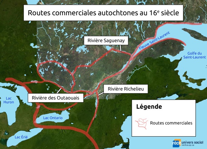 La carte représente les routes commerciales autochtones en rouge. Ces routes relient plusieurs cours d'eau comme la rivière des Outaouais, la rivière Richelieu et la rivière Saguenay, entre les Grands Lacs et le golfe du Saint-Laurent.