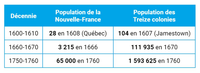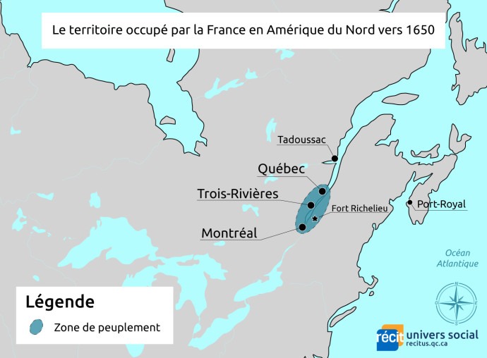 En 1608, Samuel de Champlain fonde Québec dans les environs de Stadaconé, un village autochtone qui n’est plus occupé par les Iroquoiens du Saint-Laurent depuis leur disparition. Dorénavant, les Français comptent sur ce premier établissement permanent dans la vallée du Saint-Laurent pour intensifier la colonisation de l’Amérique du Nord. La couronne française nomme cette colonie la « Nouvelle-France », un terme qui désigne le territoire occupé par les colons, mais aussi le vaste territoire revendiqué par la France aux 17e et 18e siècles. À cette époque, l’Angleterre, les Pays-Bas, l’Espagne et le Portugal poursuivent aussi la colonisation de l’Amérique, toujours en quête de richesses, de prestige et d’un passage vers l’Asie.