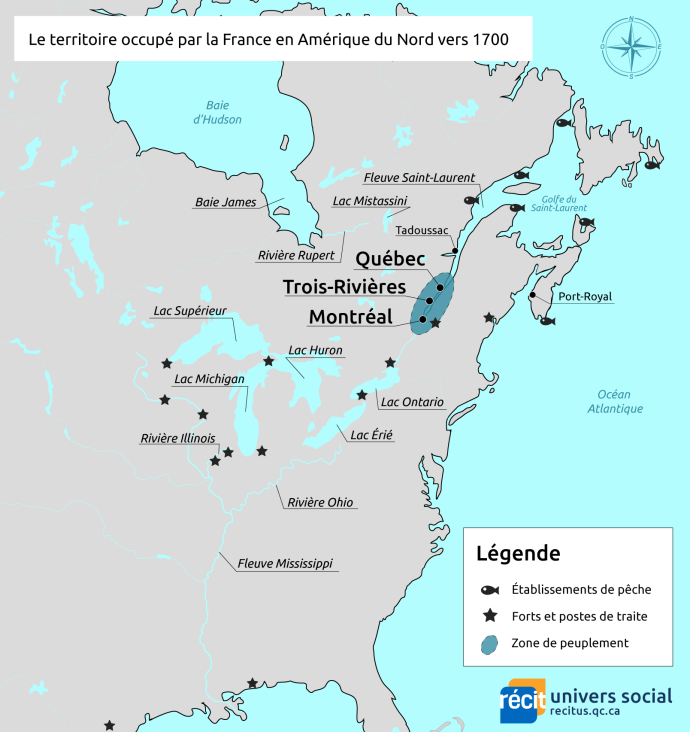 À la fin du 17e siècle, le territoire occupé par la France prend de l’expansion avec l’établissement de postes de traite, de missions et de forts dans la région des Grands Lacs et celle du fleuve Mississippi. Ces établissements permettent d’entretenir des relations avec les Premières Nations par l’entremise du commerce des fourrures, de la conversion au christianisme et de la diplomatie, qui peut impliquer des alliances et des rivalités. Dans la région du golfe du Saint-Laurent et de l’océan Atlantique, les Français intensifient leur occupation des côtes pour exploiter les ressources d’un vaste territoire de pêche dont tirent aussi profit les Britanniques.