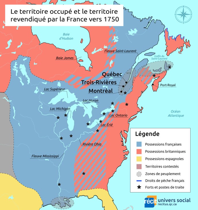 Le gouvernement royal renforce le pouvoir des autorités coloniales, qui tentent de relancer le peuplement, de diversifier l’économie et de favoriser l’exploration du territoire au-delà de la vallée du Saint-Laurent. Les colons participent à l’occupation et l’exploration de ce territoire qui fait l’objet de plusieurs rivalités, dont la guerre de la Conquête qui oppose la France à la Grande-Bretagne entre 1754 et 1760.