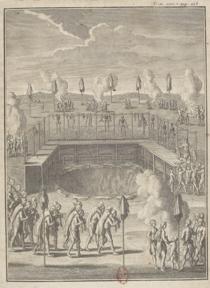Source : Joseph-François Lafitau, « Fête des morts chez les Hurons-Wendats », Moeurs des sauvages ameriquains, 1724, tome 2, p. 456, planche 22, Bibliothèque nationale de France. Licence : domaine public.