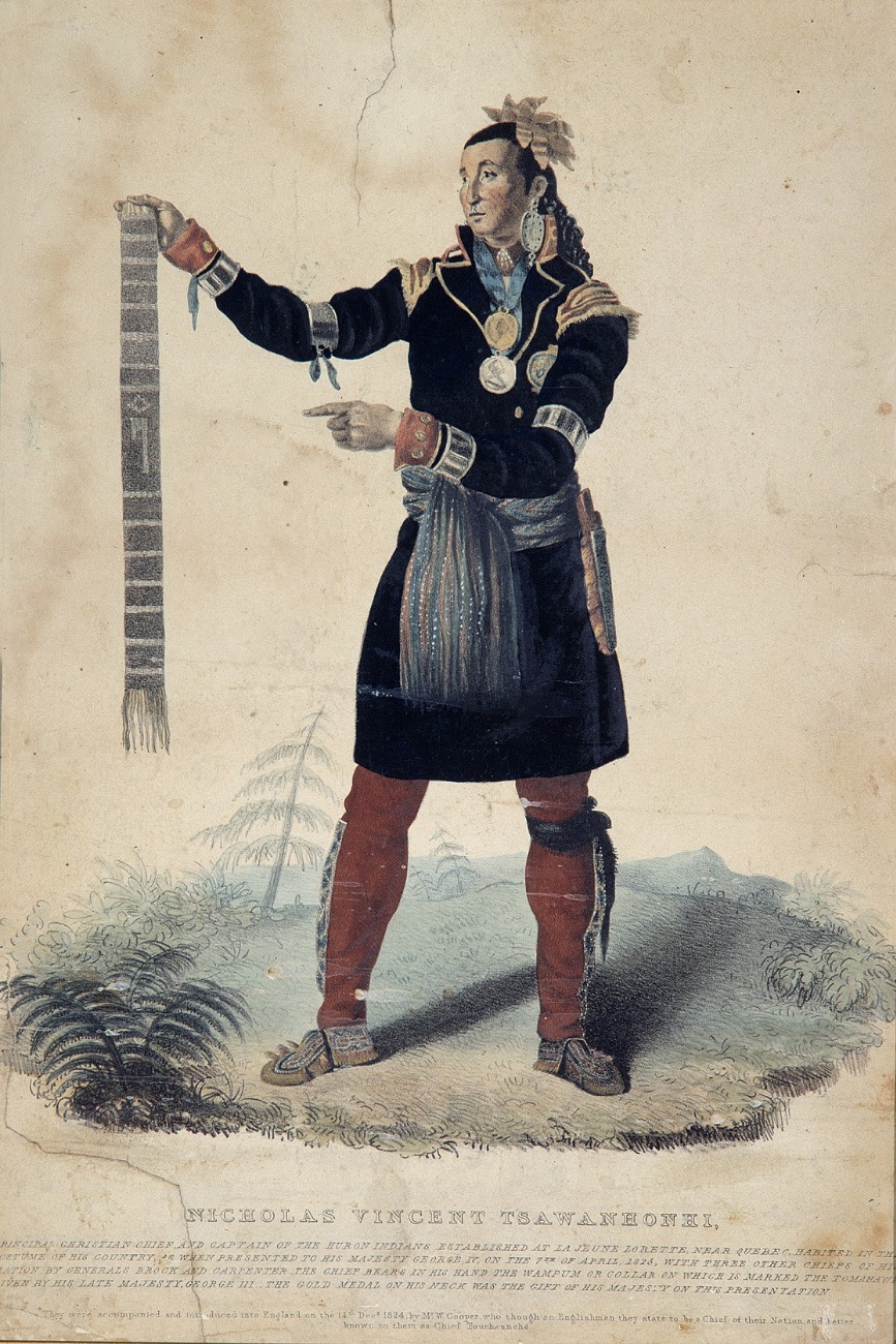 Source : Edward Chatfield, Le chef huron-wendat Nicholas Vincent Tsawenhohi après sa rencontre avec le roi Georges IV (1825), Musée McCord, M20855. Licence : domaine public.