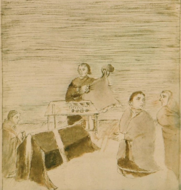 Ce dessin représente le changement des pratiques funéraires des Mohawks pour l’adoption de pratiques liées au christianisme comme la récitation du chapelet.