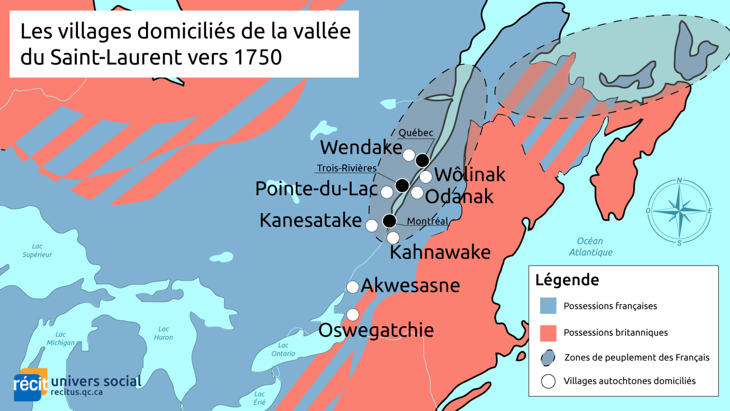 Comme les Hurons-Wendats, plusieurs autres groupes autochtones qui se convertissent au catholicisme choisissent de s’installer à proximité des villes de la Nouvelle-France au 17e siècle. On utilise parfois l’expression « domiciliés » pour qualifier ces populations autochtones qui vivent près du territoire occupé par les Français et qui adoptent partiellement la culture européenne. Parmi les villages domiciliés, Kahnawake regroupe des membres de plusieurs Premières Nations, dont certains Mohawks ayant quitté l’Iroquoisie lors d’une période de paix. Dès la fondation de Kahnawake, les missionnaires catholiques s’installent à proximité de la communauté pour poursuivre la transmission des croyances religieuses.