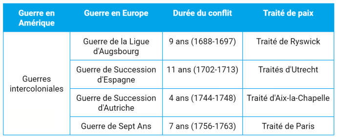 Les 17e et 18e siècles sont marqués par d’importantes tensions entre les différents royaumes européens qui cherchent à étendre leur territoire pour accroitre leur prestige et leur puissance. Cette volonté d’expansion territoriale se manifeste en Europe comme dans les Amériques, où la France et la Grande-Bretagne établissent des colonies. Lorsque les tensions entre les puissances européennes se transforment en guerres, les colonies sont également en guerre puisqu'elles sont dépendantes de leur métropole au plan politique.