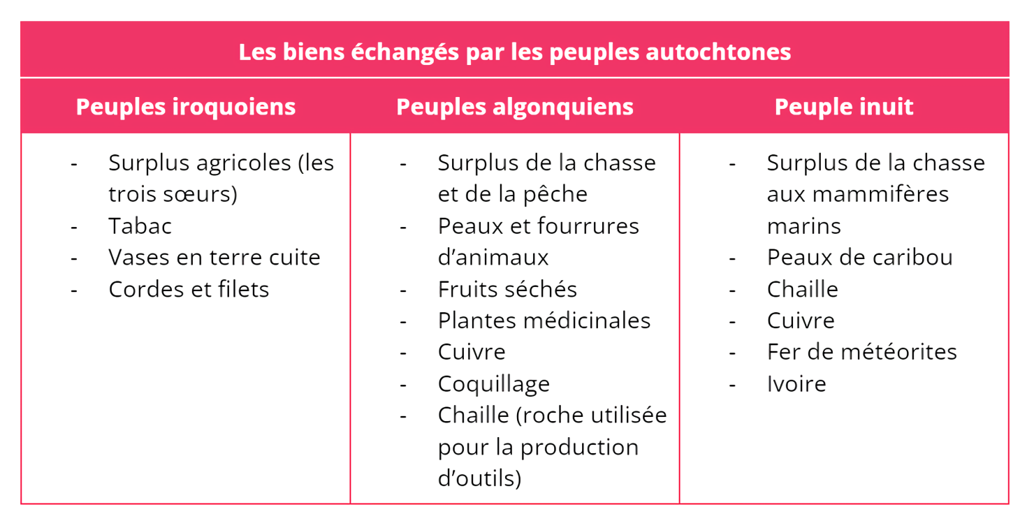 Les Premières Nations font du commerce pour des raisons économiques, mais aussi pour entretenir leurs relations politiques avec d’autres groupes. Le commerce repose d’ailleurs sur des alliances entre les peuples autochtones. À chaque fois qu’ils se rencontrent pour échanger, ces peuples pratiquent d’abord le don et le contre-don, puis ils prononcent des discours et organisent des danses. Une fois l’alliance conclue, les alliés ne peuvent pas renégocier la valeur des produits échangés, ce qui signifie qu’une ressource sera toujours troquée contre la même quantité d’une autre ressource.