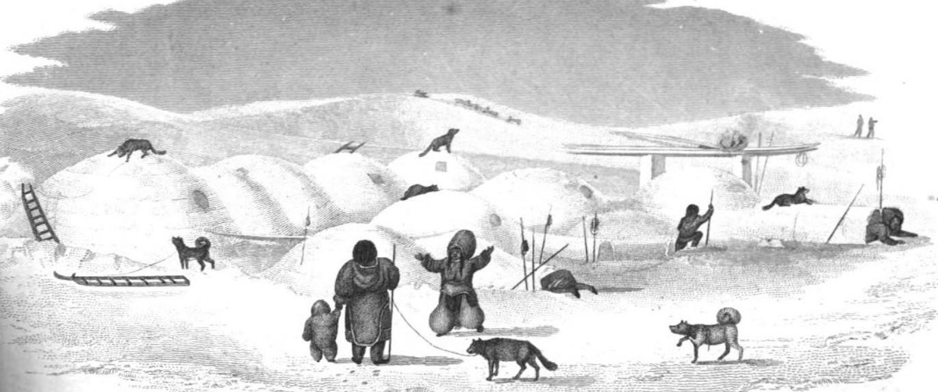 Source : Edward Finden, « Village Inuit » dans, G. F. Lyon, The Private Journal of Captain G. F. Lyon of H.M.S. Hecla during the recent Voyage of Discovery under Captain Parry, London, John Murray, 1824, p.110, New York Public Library, en ligne sur HathiTrust. Licence : domaine public.