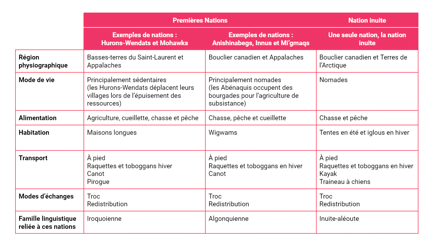 2.1. Les caractéristiques des modes de vie des premières nations et de la nation inuite vers 1500