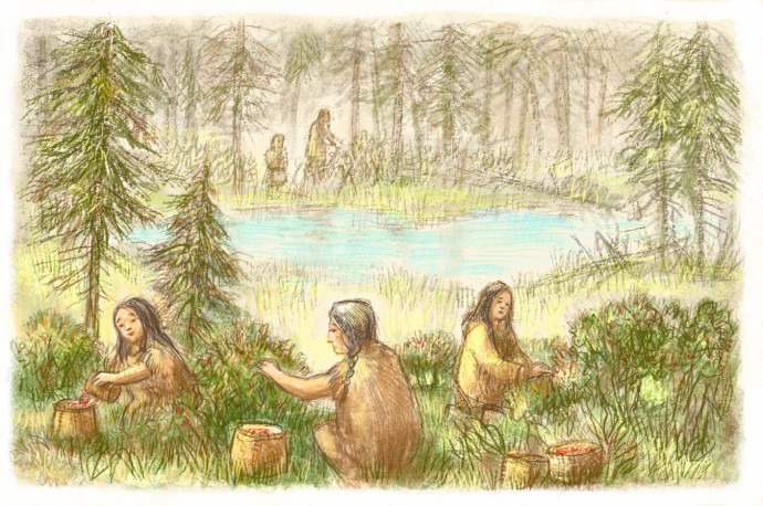 Source : Bernard Duchesne, Des femmes font la cueillette des petits fruits sur le bord d'une rivière, Création Bernard Duchesne. Licence : Creative Commons (BY-NC), contexte éducatif seulement.