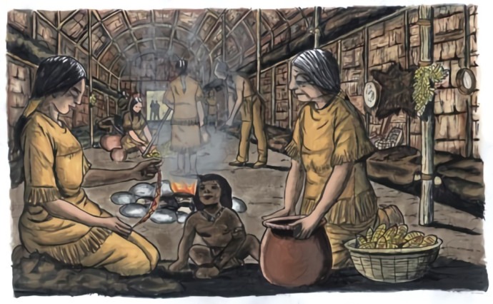 Source : Diane Boily, La vie dans une maison longue, AKI : Sociétés et Territoires autochtones, Licence : Contexte éducatif seulement (BY-NC).