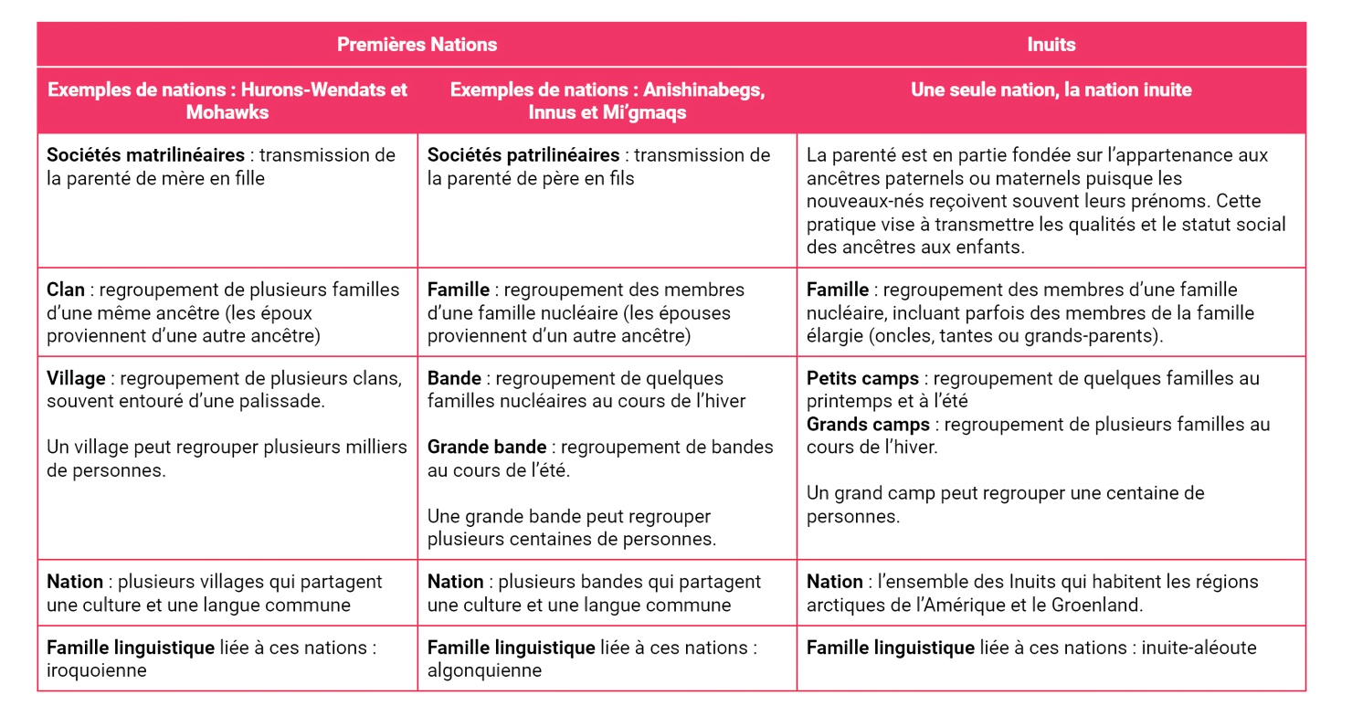 Les peuples autochtones fondent leur organisation sociale sur l’appartenance à une lignée familiale et se regroupent entre descendants d’un même ancêtre. Pour organiser les rapports entre toutes ces personnes, les membres d’un clan iroquoien, d’une bande algonquienne ou d’une famille inuite valorisent le partage des biens. En effet, les membres d’une communauté partagent les denrées qu’ils récoltent et les objets qu’ils produisent, ce qui permet de répondre aux besoins des individus tout en atténuant les inégalités sociales au sein de la collectivité.