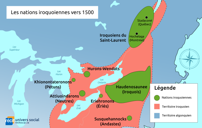 Le territoire iroquoien est représenté en rouge. Le territoire algonquien est représenté en bleu. Les zones vertes illustrent l'occupation du territoire par les Khionontateronons (Pétuns), les Attiuoindarons (Neutres), les Eriehronons (Ériés), les Susquehannocks (Andastes), les Hurons-Wendats, les Haudenosaunee (Iroquois) et les Iroquoiens du Saint-Laurent.