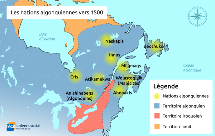 Au 16e siècle, plusieurs peuples autochtones habitent et utilisent le territoire actuel du Québec, des peuples que l’on désigne aujourd’hui comme les Premières Nations. À ces Premières Nations s’ajoute la nation inuite, un peuple formé par des groupes nomades de la famille linguistique inuite-aléoute.