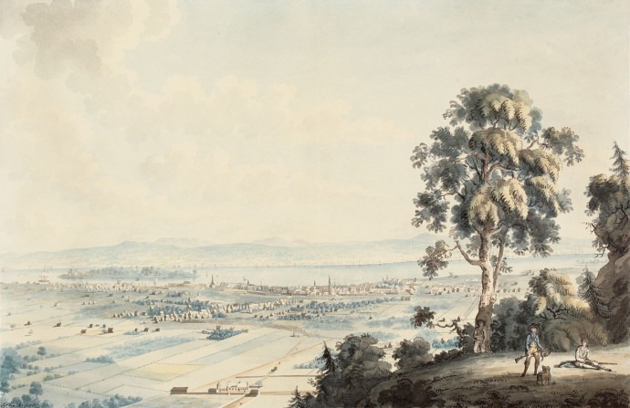 Source : James Peachey, Montréal, vue de la montagne (1784), Bibliothèque et Archives Canada, 2898335. Licence : domaine public.