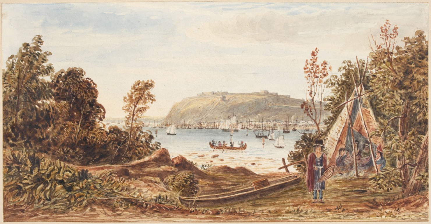 Source : Artiste inconnu, Vue de Québec depuis le rassemblement d’Autochtones sur la rive de Lévis (vers 1830), Bibliothèque et Archives Canada, 2898543. Licence : domaine public.
