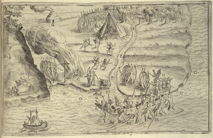 Source : Samuel de Champlain, Une escarmouche au port Fortuné (1613), Bibliothèque et Archives Canada, 3919819. Licence : domaine public.