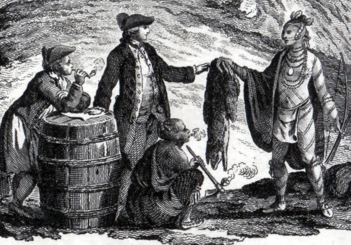 Source : William Faden, Des Britanniques font des échanges avec un membre des Premières Nations (1777), Library of Congress, 2004670239 Licence : domaine public.
