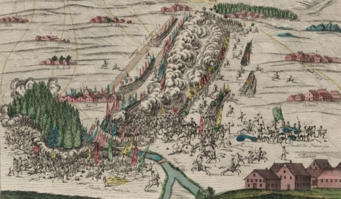 Source : G. Stettner, Bataille de Crevelt ou le Comte de Clermont est battu par les Hanovriens (1758), Bibliothèque nationale de France. Licence : domaine public.