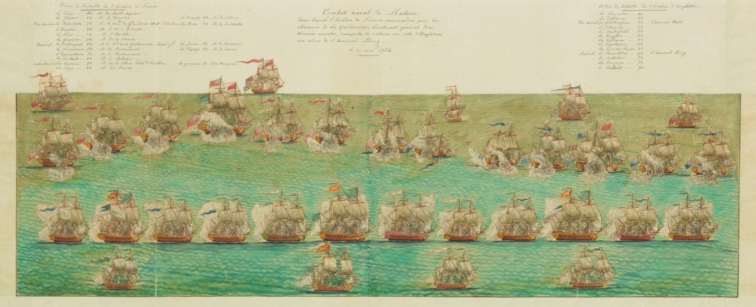 Source : Auteur inconnu, Combat naval de Mahon dans lequel l'Escadre de France commandée par le Marquis de La Galissonière, lieutenant général des Armées navales, remporta la victoire sur celle d'Angleterre aux ordres de l'amiral Bing (1756), Bibliothèque nationale de France. Licence : domaine public.
