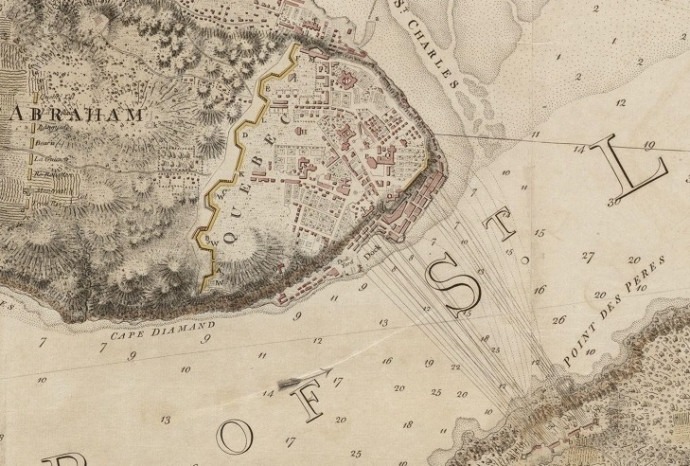 Source : Joseph F. W. Des Barres, Plan de Québec et des environs montrant les défenses françaises et les opérations britanniques en 1759 (1779), Norman B. Leventhal Map & Education Center, Boston Public Library, 06_01_004953. Licence : domaine public.