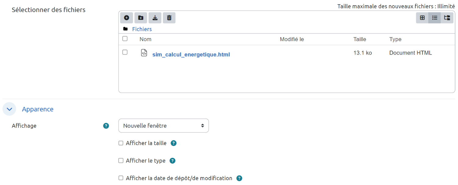 Exemple : sim_calcul_energetique.html - Dans Moodle, passer en mode Édition et glisser déposer votre fichier